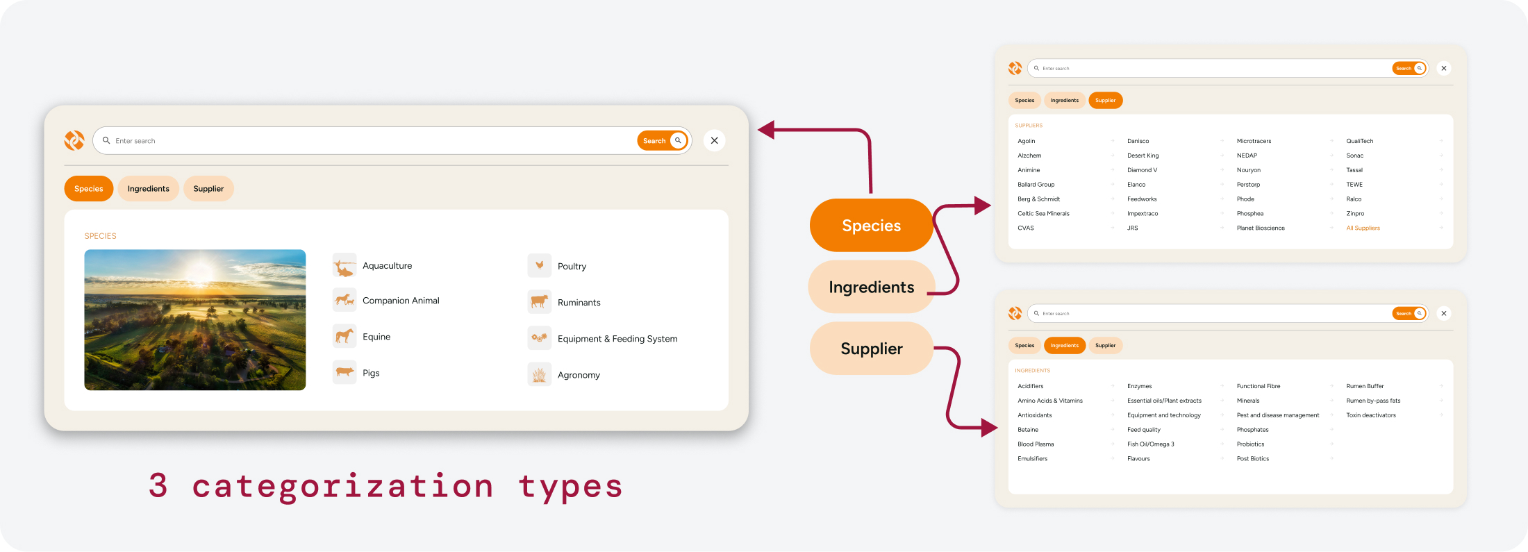 I introduced a categorization system not only by species, but also by ingredients, and suppliers. This supported multiple browsing strategies and aligned with how large-scale farmers evaluate products.