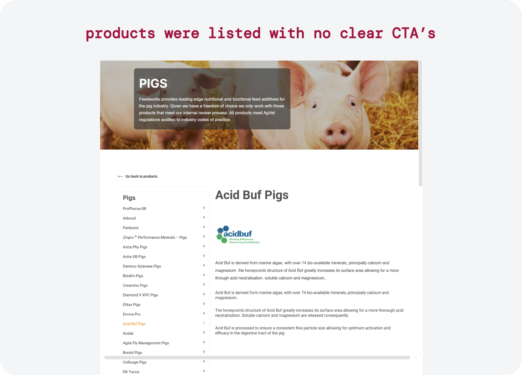 The existing website resembled an e-commerce store but lacked pricing, checkout, and transactional flows. As a result, the users expected to see prices and unit measures but are left confused when they visit the product page.