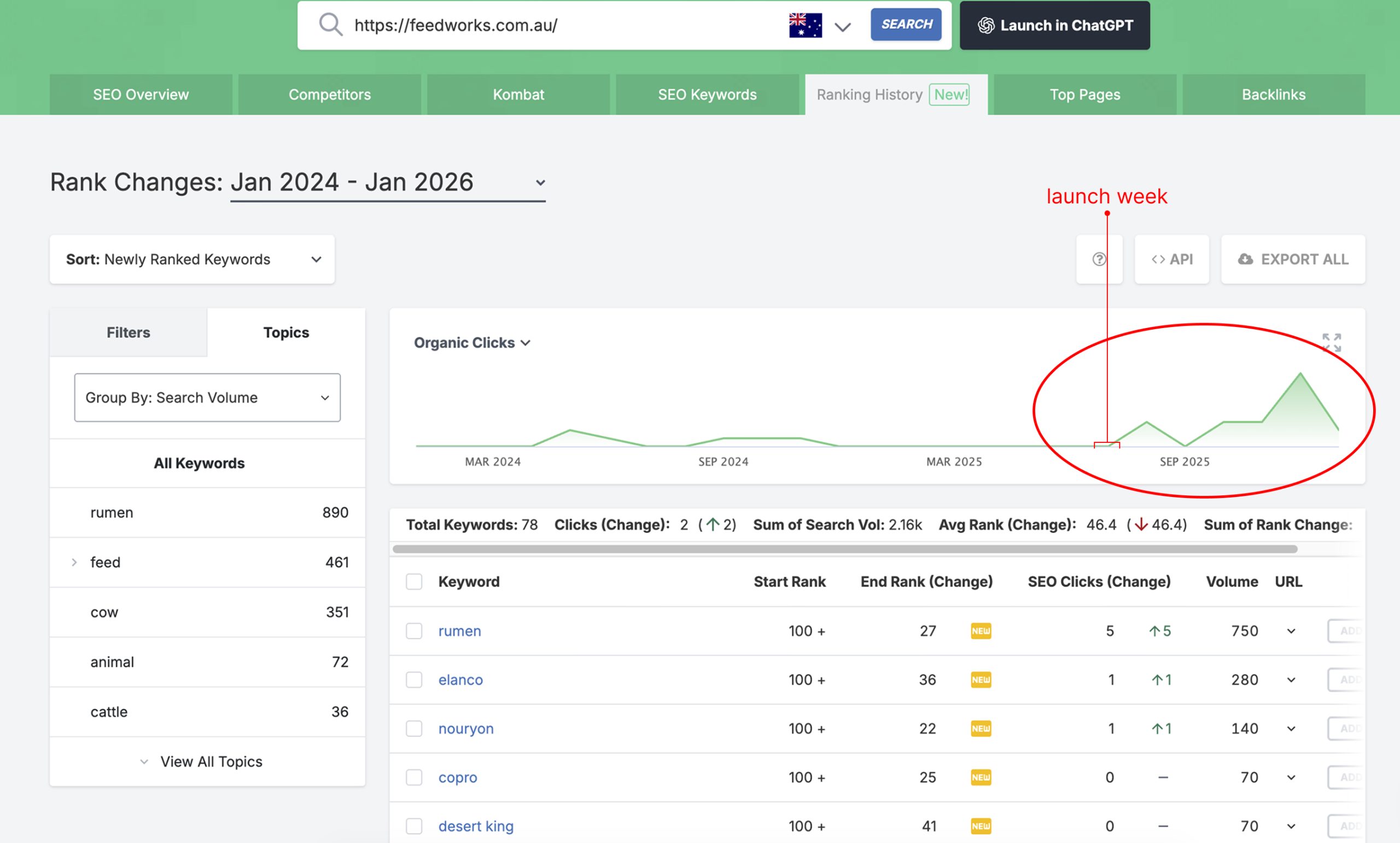 - Newly ranked keywords clustered around ingredients, suppliers, and functional concepts (e.g., rumen, supplier brands), confirming demand beyond species-based navigation.